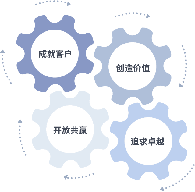 成就客户是一切决策的出发点,,创造价值是衡量所有工作的标准,,追求卓越是我们做事做人的态度,,开放共赢是我们的格局也是最终的结果。。价值观的齿轮环环相扣,,,,推动着组织里的每个人不断向前。。